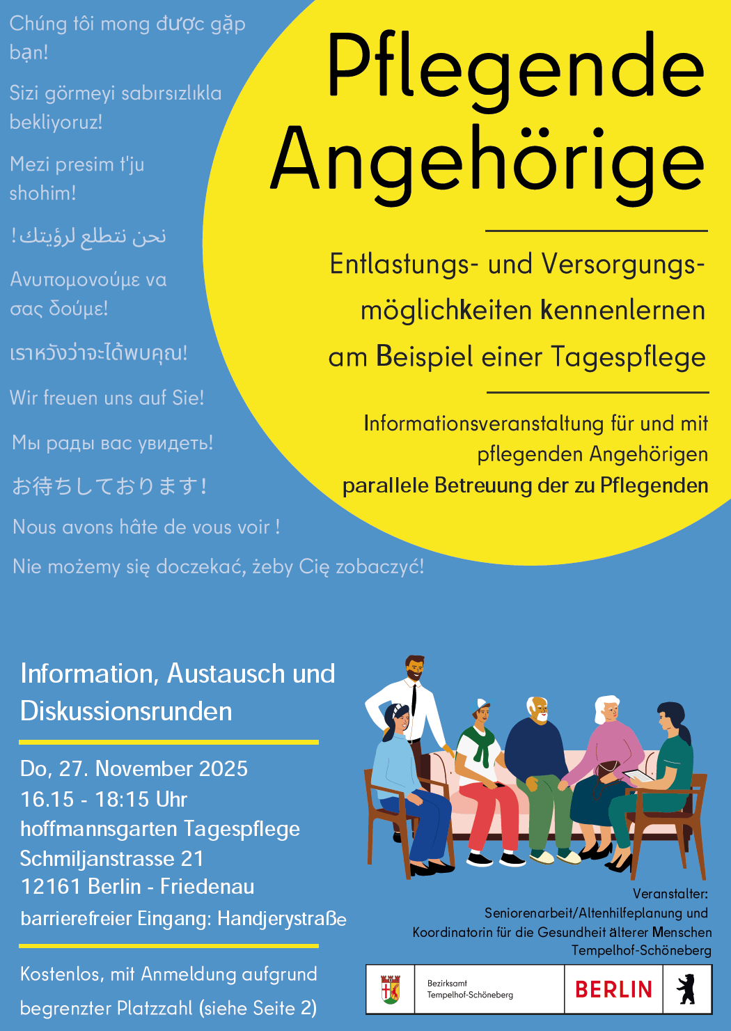 Kostenlos, wichtig: Anmeldung aufgrund begrenzter Platzzahl für Betreuung der zu Pflegenden bei Katja Wohner: Mail: wohner@ba-ts.berlin.de, Tel.: 030 90277 6519