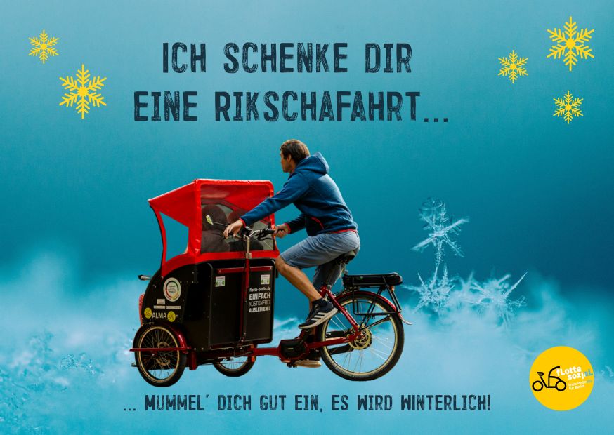 Auf der Suche nach einem besonderen Geschenk für Weihnachten? Wie wärs mit einem Gutschein für eine gemeinsame Rikschafahrt? Sobald das Wetter es erlaubt, könntet ihr gemeinsam Zeit verbringen, einen Ausflug unternehmen, umsonst und draußen eine Runde drehen, einen Ausflug in die Nachbarschaft, in den Park oder aufs Tempelhofer Feld unternehmen. In der Rikscha können vorne zwei Personen Platz nehmen, dahinter tritt eine(r) in die Pedale – natürlich mit elektrischer Unterstützung – so dass alles ganz leicht geht.