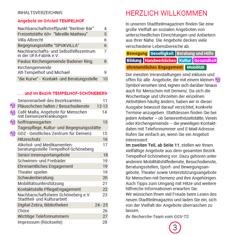 Wir freuen uns, dass wir nach drei Jahren nun eine neue, aktualisierte und erweiterte Auflage unserer Stadtteilmagazine vorstellen können. In fünf Magazinen für die fünf Bezirksregionen Schöneberg Nord, Schöneberg Süd und Friedenau, Tempelhof, Mariendorf und Marienfelde/Lichtenrade finden Sie auf 28 Seiten Angebote für ältere Menschen, um Kontakte zu knüpfen, um auf neue Ideen zu kommen, Hilfe in Notlagen zu finden und vieles mehr. In unseren Stadtteilmagazinen finden Sie eine große Vielfalt an sozialen Angeboten von unterschiedlichen Einrichtungen und Anbietern aus Ihrer Nähe. Die Angebote decken viele verschiedene Lebensbereiche ab. Es sind Angebote gegen die Einsamkeit und für eine inklusive Gesellschaft. digitale